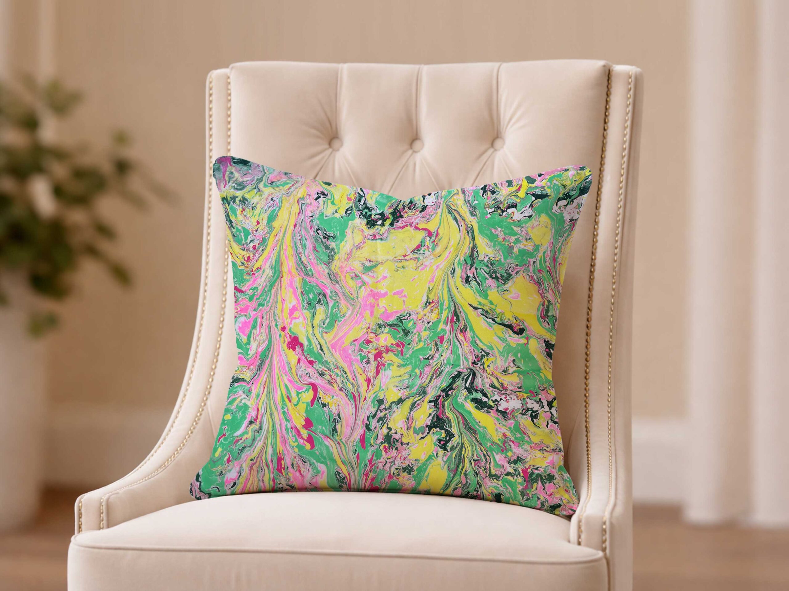 Vivid chartreuse and acid yellow collide with saturated emerald, hot pink, and inky shadow tones. Vertical marbling creates a sense of upward movement and kinetic tension, making this surface both fearless and architectural.