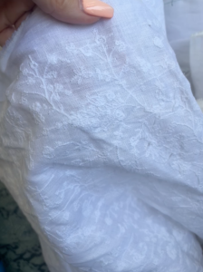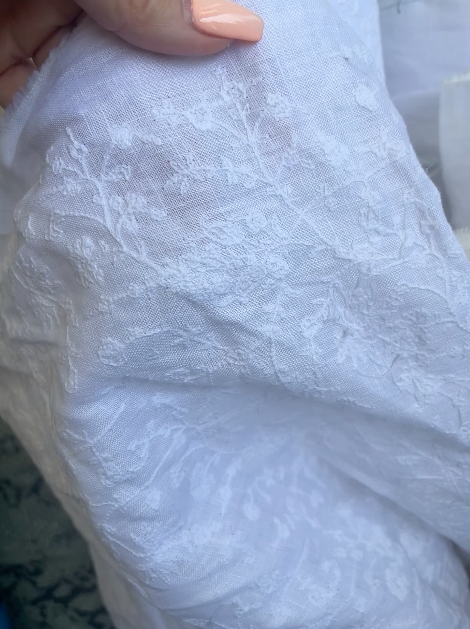 1/2 yard white embroidered linen fabric with “split the shipping”.