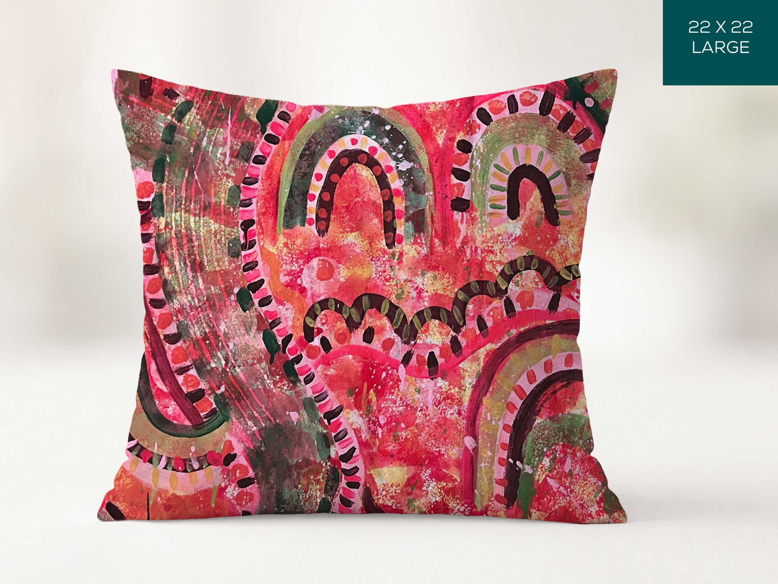 This 22 x 22 pillow is made from an original painted textile panel and finished with a complementary linen or canvas backing.