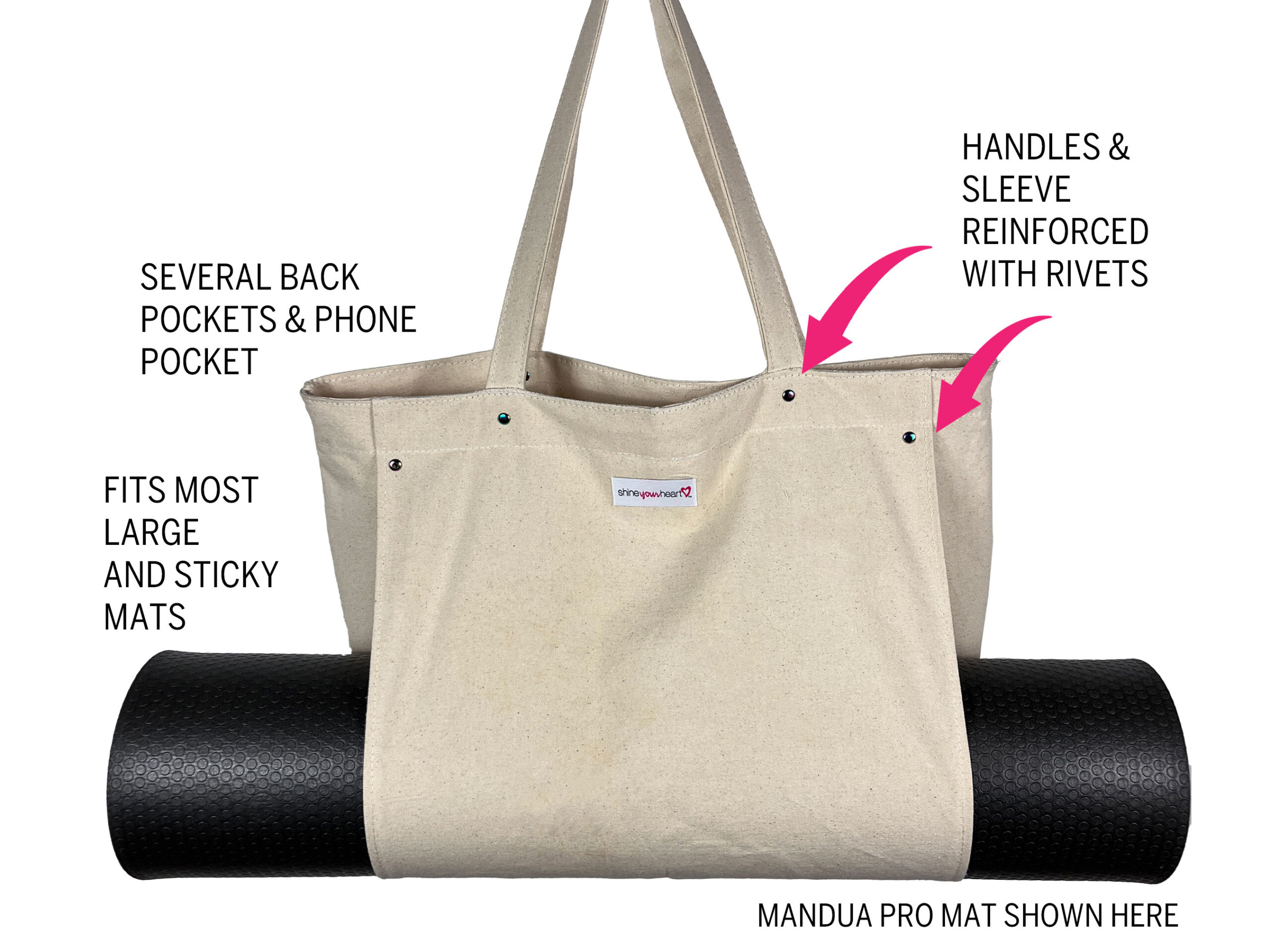 If you are looking for a simple solution for getting your things to yoga, look no further than our Yoga Tote Essentials. The Yoga Tote Essentials is a single layer tote bag, open top design with a front sleeve that will fit most standard/sticky/large yoga mats (Manduka Pro shown in photo).